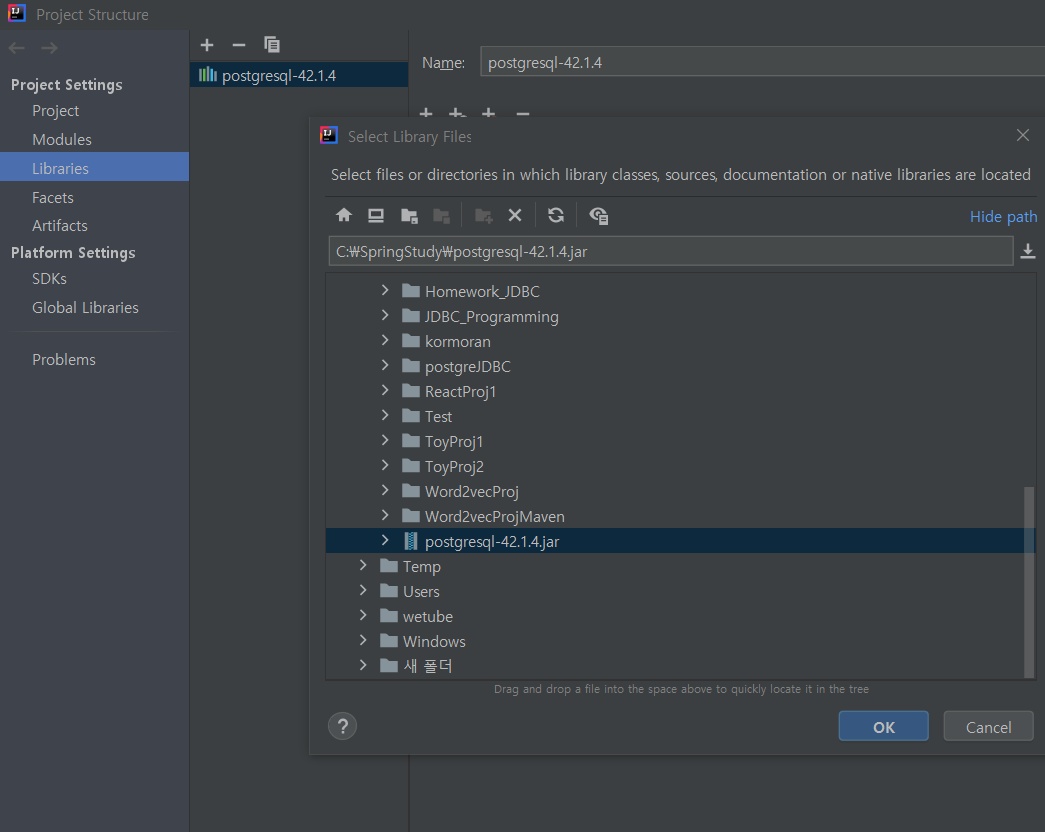 -설치 후 프로젝트 설정> Libraries> 다운로드한 jar파일 선택